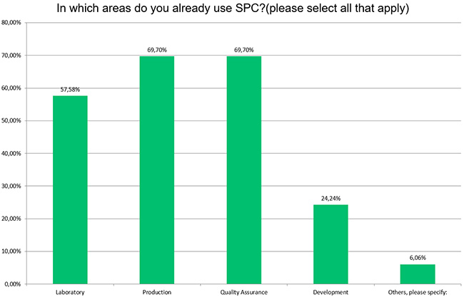 Things got exciting when it came to the question in which areas SPC is used (multiple answers were possible). Here, 70% cited production and quality assurance. 58% cited the laboratory area, followed some way behind by development (24%).